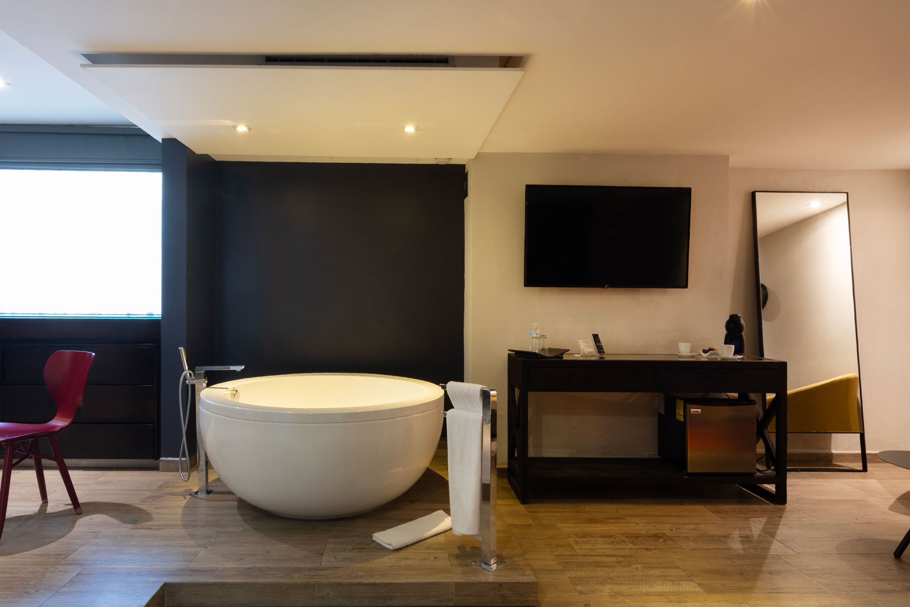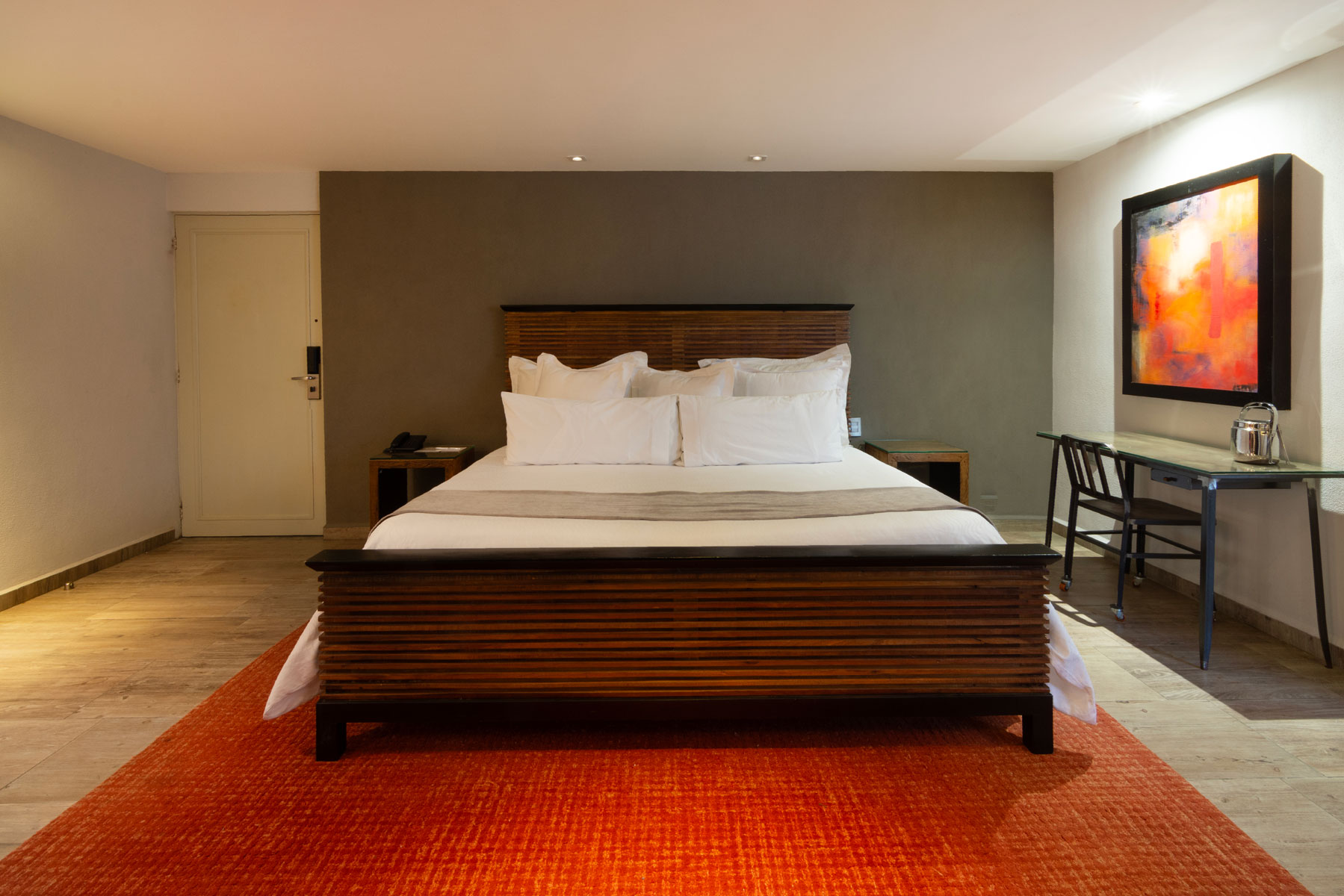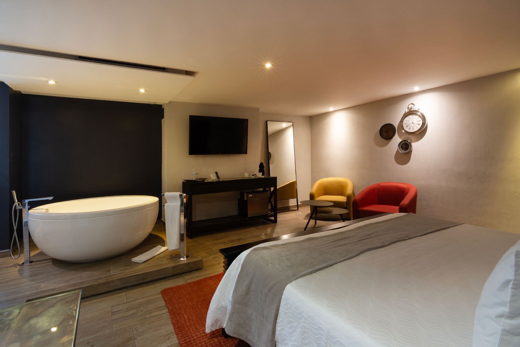 Estas suites ofrecen una atmósfera sofisticada con una acogedora sala de estar y un escritorio de trabajo ideal para quienes buscan equilibrio entre confort y productividad.
